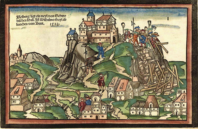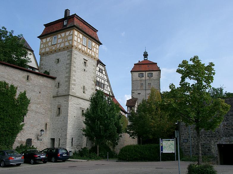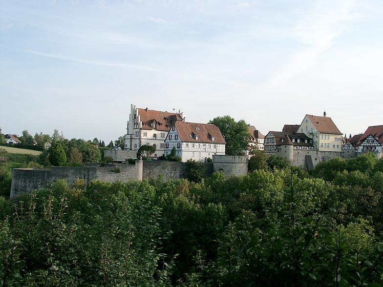 Stadt Vellberg - Stadtinfo"Die neue Burg Vellberg wurde vermutlich zwischen 1076 und 1086 errichtet. Als Tochter König Konrads III. wird im 12. Jahrhundert eine "Ludimilla de Vellberg" genannt. Vellberg befand sich damals im staufischen Besitz, wird 1188 "castrum Wiliberch" im Eheverlöbnis des Sohnes Kaiser Friedrichs I. Barbarossa genannt.Ab 1466 wurde der Vorhof befestigt und die Befestigungsanlagen weiter ausgebaut. Ein Burgfriede von 1481 stellte eine erste Vellberger Gemeindeordnung dar. 1500 verlieh Kaiser Maximilian das Recht, jährlich vier Märkte abzuhalten. Mit der hohen Blutgerichtsbarkeit erlangte Vellberg 1506 auch seine Stadtrechte. Als Wilhelm von Vellberg 1523 den gesuchten Thomas von Absberg bei sich beherbergte, zerstörte der Schwäbische Bund bei seiner Strafexpedition das Schloss. 1543 bis 1546 baute Wolf von Vellberg das Wahrzeichen wieder auf.Konrad war der letzte Ritter von Vellberg, der die gesamten Besitztümer vereinigte und damit die größte flächenmäßige Ausdehnung Vellbergs erreichte. Mit seinem Tod starb das Geschlecht 1592 aus. 1595 verkauften Konrads Erben das Städtchen an die Reichsstadt Hall." |