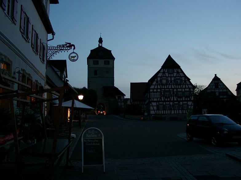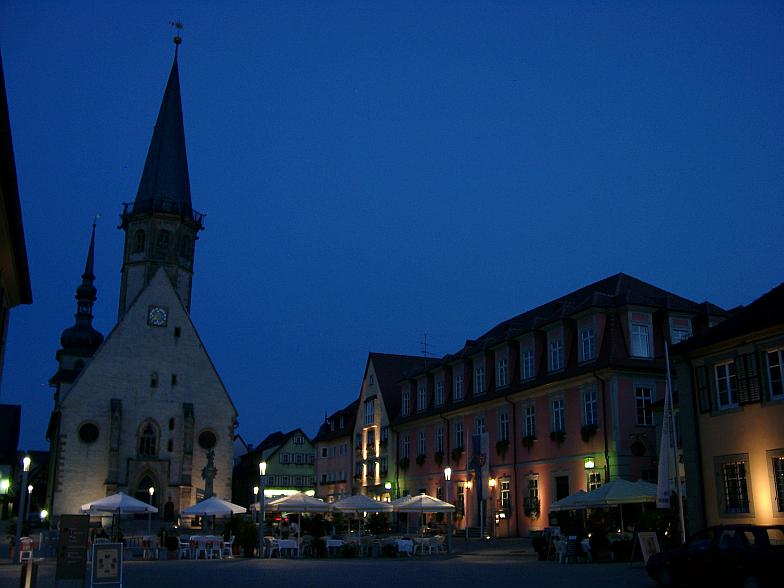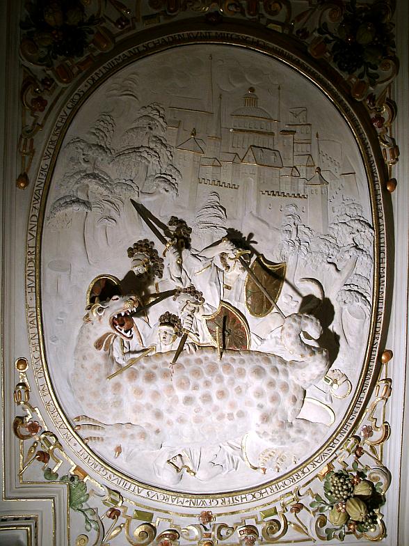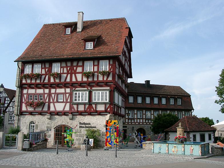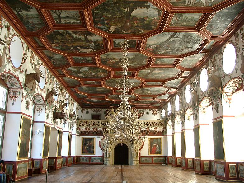 Schloß Weikersheim - Wikipedia (gekürzt)"Um 1153 werden erstmals Konrad und Heinrich von „Wighartesheim“ als Herren einer Wasserburg genannt. Konrad nannte sich später „von Weikersheim“, Heinrich jedoch „von Hohenloch“ nach dem Dorf Hohlach bei Uffenheim. Der Name Weikersheim verschwand als Familienname, und Hohenloch wurde zu Hohenlohe. Die alte Burg war eine Ringmauerburg mit einem breiten Graben und dem Bergfried neben dem Zugang vom Ort.Bis 1586 änderte sich nichts Entscheidendes an der Burg. Doch in diesem Jahr kam Graf Wolfgang II. von Hohenlohe-Langenburg durch Erbteilung in den Besitz von Weikersheim. Auf dem Grundriss eines gleichseitigen Dreiecks und unter Einbeziehung des staufischen Bergfrieds, der eine barocke Haube erhielt, entstand ein Schloss, das der idealen Renaissance-Schlossarchitektur entsprach, aber auch schon barocke Ansätze in sich trug. Im Jahr 1605 war der Bau im Wesentlichen vollendet.Kern und Prachtstück des Schlosses ist der Rittersaal mit seiner freitragenden Kassettendecke von Balthasar Katzenberger aus Würzburg. Graf Wolfgang II., der die Triebfeder der Bauarbeiten war, zog jedoch nie mit seinem Hofstaat in den Neubau um. Auch die alte Burg wurde nicht wie geplant abgebrochen.Während des Dreißigjährigen Krieges kamen die Baumaßnahmen zu einem Stillstand. 1634 wurde das Schloss durch die Truppen des Generals Johann von Werth vollständig geplündert, und wenn „... der Türke mit seinem Volk dagewesen wäre, so hätte es nicht schlimmer aussehen können.“ " |