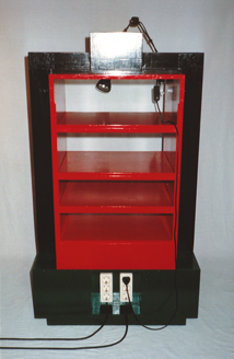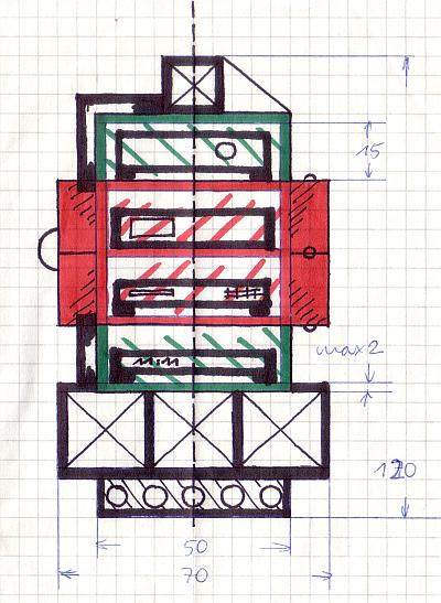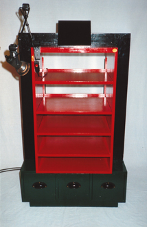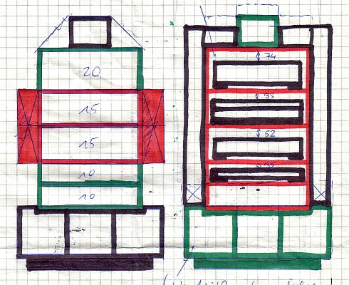 Ein HIFI-Rack aus Holz mit den Maßen ca. 70x120x50 cm (BxHxT). Innen befinden sich Lochreihen, so daß die Abstände der Platten (mit Durchschubsicherung) für die verschieden hohen Hifi-Komponenten eingestellt werden können. Der abgebildete Alternativ-Entwurf mit den seitlich diagonal angeordneten Kästen gelangte nicht zur Ausführung. Umgesetzt wurde die Rahmenvariante, die ein wenig an eine Magnetspule mit Eisenkern erinnern soll. Womit der Bezug zur Elektrik hergestellt wäre... |