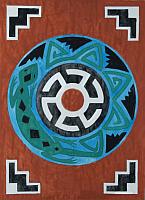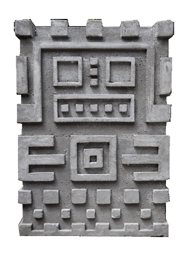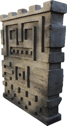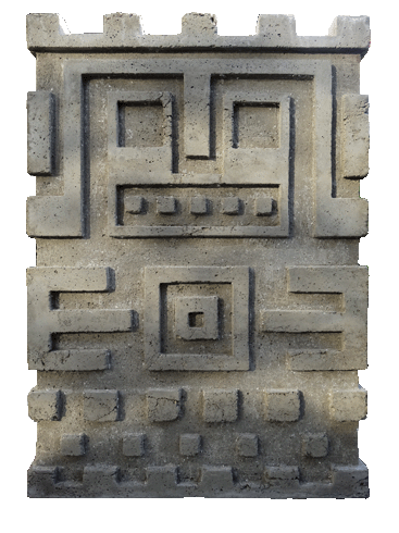 Quellstein granitoben dargestellt vor Mauer des Haupttempels,unten im Sonnentor, von Tiahuanacu in Bolivien.© 2013Werkstein, 40x60x8 cm (BHT) |