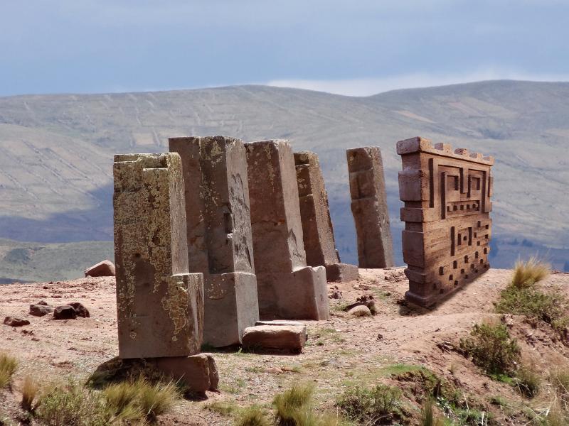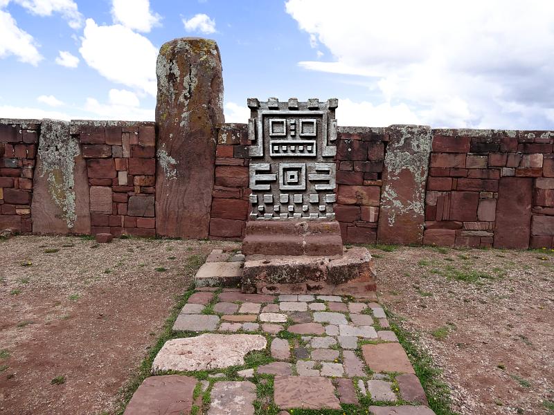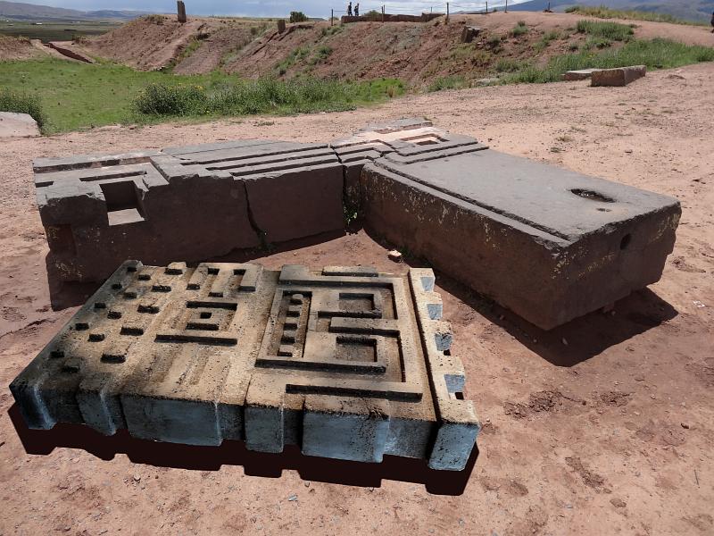 Quellstein sandoben und unten dargestellt auf Pyramidevon Tiahuanacu in Bolivien.© 2013Werkstein, 40x60x8 cm (BHT) |